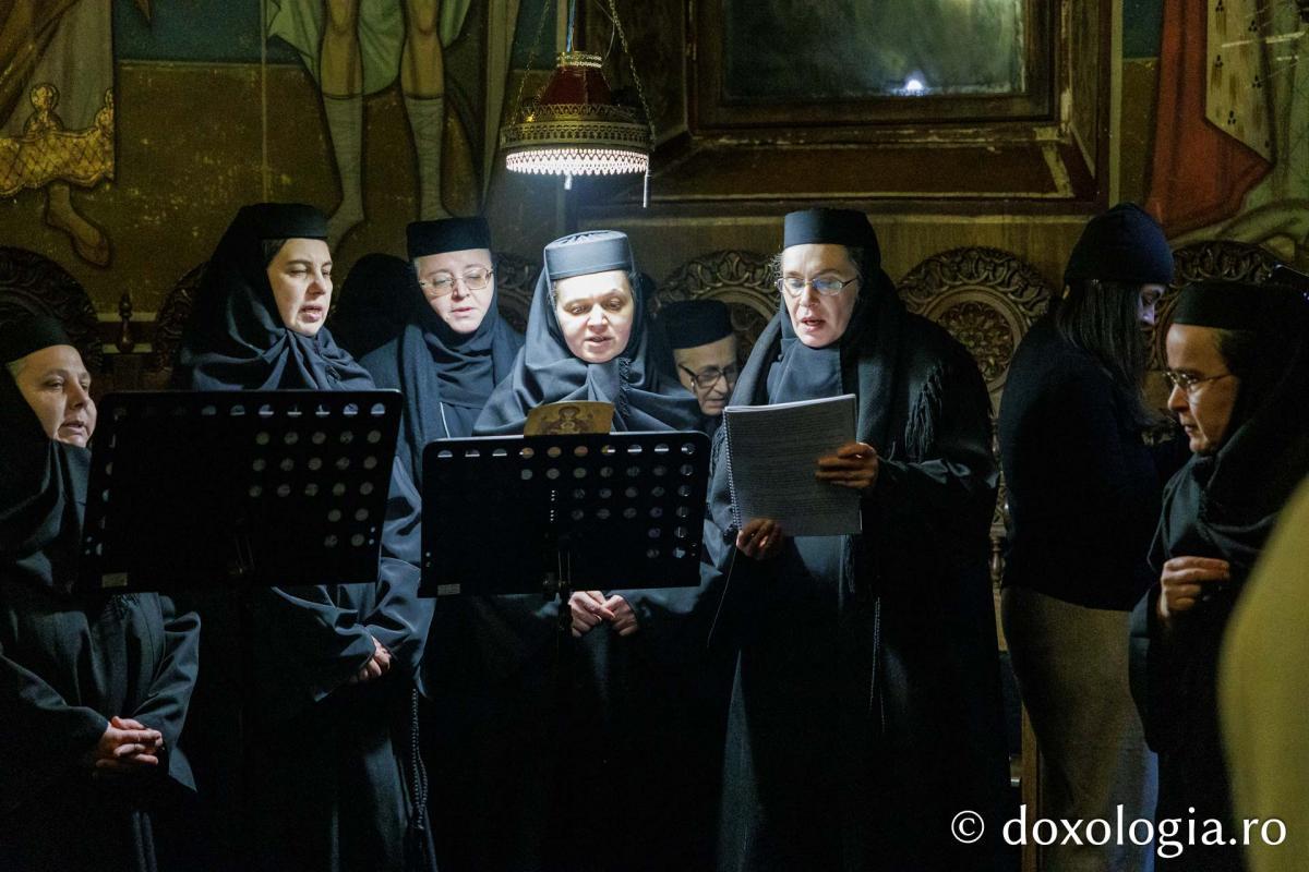 La slujba privegherii a slujit un sobor de preoți și diaconi sub protia părintelui arhimandrit Elisei Nedescu, starețul Mănăstirii „Sfinții Trei Ierarhi” din Iași, iar răspunsurile liturgice au fost date de Corul preoțesc „Apostolii” (în strana dreaptă) și, respectiv, de corul mănăstirii Copou (în strana stângă).